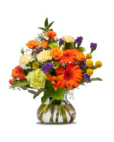 Our Premium Design, Papaya Whip, features a selection of premium blooms in bright fall colors designed in a clear vase. Papaya Whip will whip any room into cheerful shape with its hot, vibrant colors. Send classic flower favorites as a birthday gift, “get well” greeting, Father’s Day gift (because dad likes flowers, too!), thank you gift with a personal note, Thanksgiving table decor, or just because!